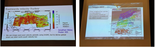 这次会议上关于震间-震时-震后形变及地质构造变形的专题和报告最多,不言而喻这是InSAR技术的主要应用领域。这方面的应用主要集中在三个方面:一是利用高精度高密度InSAR技术对地震震例进行详细解剖,包括地震造成的地表形变场,地表破裂带,震源断层模型和破裂机制等,其次是震后形变场的观测研究及地壳-上地幔粘弹性参数的反演研究,三是长期缓慢震间形变的监测研究(如图3)。随着这几年时序InSAR技术在提取断层微小形变技术的发展与完善,以及多颗高分雷达卫星(比如Sentinel-1卫星)的出现,全球覆盖的高空间和时间分辨率的雷达数据获取成为现实,欧洲的COMET组织提出了基于InSAR和GPS构建全球新一代地壳运动速度场的概念,这也是目前国内外地震行业InSAR研究人员正在努力实现的目标。