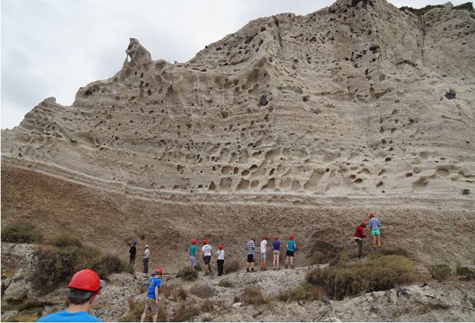 考察重点之一的圣托里尼火山岛位于爱琴海南部,希腊克里特岛北部120公里,非洲板块与欧亚板块的缝合带附近。该岛是一个火山岛,也是南爱琴海火山岛弧最活跃的部分。历史上,圣托里尼曾发生多次火山爆发,公元前1500年的火山喷发最为严重,岛屿中心大面积塌陷,原来圆形的岛屿呈现了今天的月牙状。这次喷发不仅导致了巨大的自然灾害(亚特兰蒂斯的沉没),喷发也导致东地中海地区巨大的气候变化,它也是地球上几千年来发生的最大的火山喷发事件。托里尼岛沉积了厚约60米的白色火山灰沉积,它们的底部才是当时的地面。这个地层可以被分为五个旋回,分别对应喷发中不同的阶段。