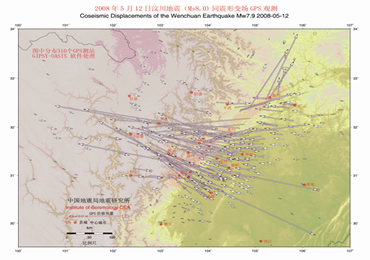 汶川地震是大陆内部的巨大地震事件,虽然地震地质考察已经发现了沿映秀-北川断裂和灌县-江油断裂形成的地表破裂带及其同震位移,但无法给出地表破裂以外的区域同震位移场。而地震引起的区域和远场的变形图像是认识发震断裂运动学性质不可缺少的方面,对于研究地震的破裂特征和判定未来地震趋势具有重要的意义。地震发生后,中国地震局立即会同国家测绘局在第一时间对以震区为中心的“中国地壳运动观测网络”区域GPS站进行了复测;随后,中国地震局汶川地震科学考察队又会同四川省测绘局对四川省的GPS控制网进行了复测,获得了十分宝贵的同震位移场(见图)。
