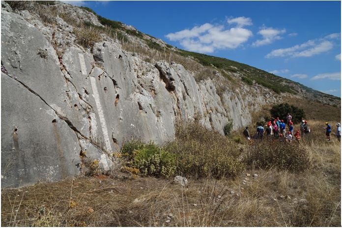 与此同时,郑文俊研究员、王伟涛副研究员与菲利普·英格兰教授、詹姆斯·陶姆教授、理查德·凯兹教授一起考察了Perachora-Pisia断层、Arkitsa断层、Kamena Vourla 断层的活动习性、变形特征、运动机理。参加本次考察,郑文俊研究员与王伟涛副研究员收获颇丰,不仅为相似构造特征的我所研究生宁夏野外地质实习积累了宝贵的经验,除此之外,希腊大陆现今处于伸展背景,这与我国中、西部鄂尔多斯周缘断裂带的构造背景相似,考察希腊大陆内部断裂活动机理对于研究我国中、西部鄂尔多斯周缘断裂带的运动学特征、地震复发周期、以及可能产生的地震灾害具有重要意义。