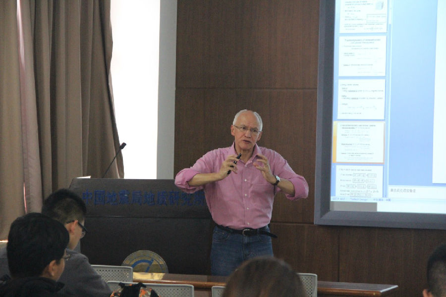 应地震动力学国家重点实验室邀请,著名岩石变形专家、荷兰乌得勒支大学教授、地震动力学国家重点实验室客座教授Chris Spiers博士于2017年10月9日~13日在地质所开设了研究生课程《Deformation processes in minerals, rocks and faults》,来自地质所、北京大学等单位的研究生和青年科技工作参加了课程的学习。授课内容选自Spiers教授在乌得勒支大学开设的研究生课程,以岩石变形机制为主题,包括变形体系的基本理论、各向异性晶体材料弹性行为、固体非静水压力和非平衡热动力学、空位扩散热动力学、固态扩散蠕变和超塑性流动、固体/液体/熔体系统的变形、位错动力学和晶内塑性流动、变形微观结构和组构、断层和地震力学中的应用等。Spiers教授通过耐心细致的讲解、生动形象的比喻,深入浅出地讲授这门难度很高的课程,取得了良好的效果,得到听课人员的好评。