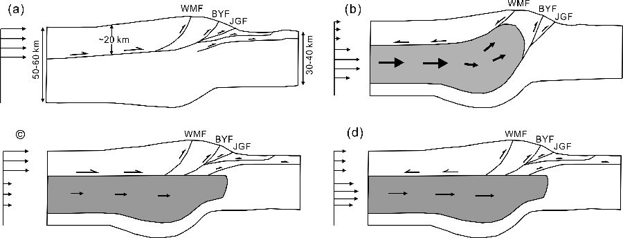 根据本研究获得的龙门山中段三条主要断层晚新生代以来的运动学性质,我们认为上地壳缩短是龙门山隆升的重要机制之一。本研究结果否定了图2b对于龙门山隆升机制的解释,即否定了“彭灌杂岩是被中下地壳物质流动顶起的”这一认识,但是不能完全否定中下地壳的增厚对于龙门山隆升的贡献。