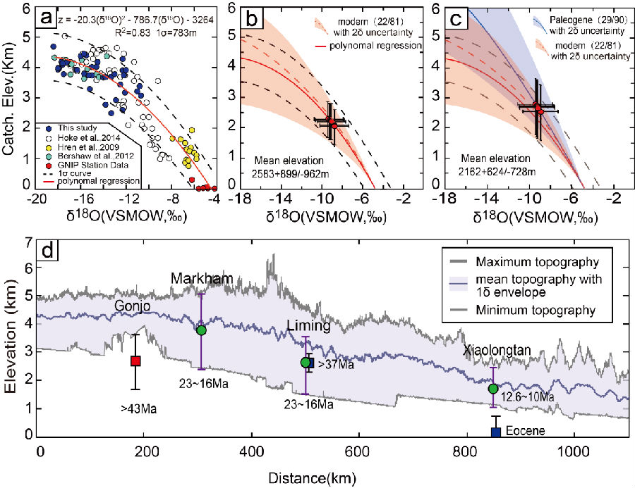其结果及分析发现,无论是用现代降水的氧同位素-高程分馏模型拟合还是推测的古近纪大气降水条件,贡觉盆地在古新世-始新世(~43.2Ma之前)古高度已达到最低2100-2500m。综合青藏高原东南缘其它古高度研究结果,本次研究推测青藏高原东南缘的大部分地区(25.5°N以北)在始新世-渐新世就已经达到或接近目前的海拔高度(图2)。该研究不仅对青藏高原东南缘在古新世-始新世地貌特征提供了重要约束,不支持较流行的下地壳流模型对高原东南缘地表抬升的解释。