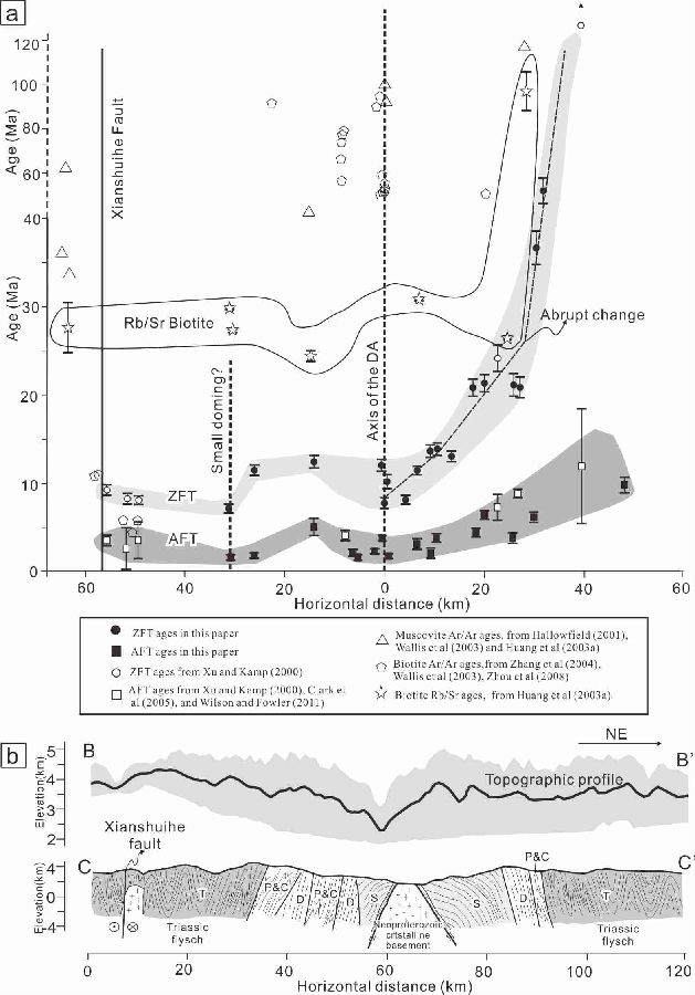 图1、丹巴背斜地区沿北东-南西向的的热年代学年龄分布