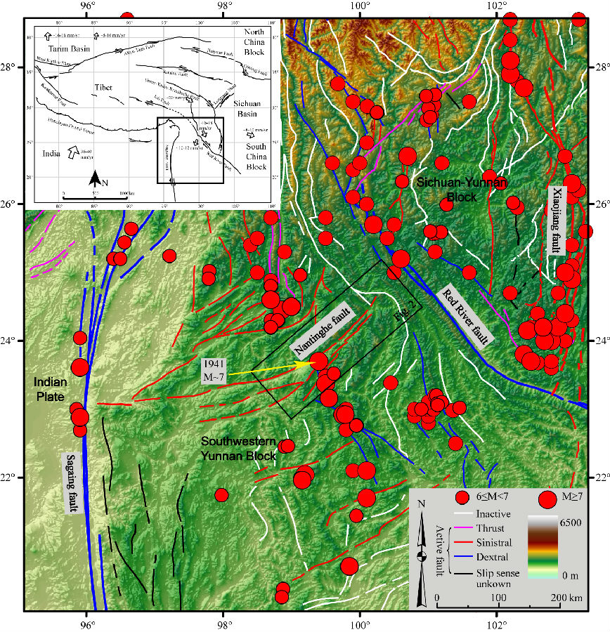 印度板块与欧亚板块的碰撞造成了青藏高原的隆升;随着高原的不断发展,高原内部的活动块体(如川滇块体和滇西南块体)沿各自的边界断裂向南东方向发生了侧向挤出运动。在青藏高原的东南缘,为了调节区域的地壳运动和变形,大量活动断裂在此发育,使得该区域的地震活动十分强烈。迄今为止,历史和仪器地震记录显示,区域内六级及以上震级的地震都主要发生在活动块体的边界断裂上,如南北向的小江断裂和实皆断裂、南南东向的红河断裂等(图1)。这些块体的边界断裂由于其快速的运动速率和频繁的地震活动,吸引了大量的研究工作;而块体内部的断裂则往往被忽略。然而,调查这些断裂的活动特征不仅有助于了解活动块体内部的地壳变形机制,对评估地震活跃区域的地震危险性也具有非常重要的意义。