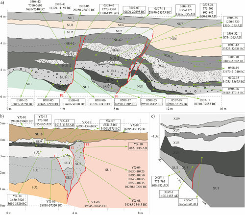 图2、 南汀河断裂带探槽剖面图(a、五堆箐北探槽;b、五堆箐南探槽;c、小果园探槽)
