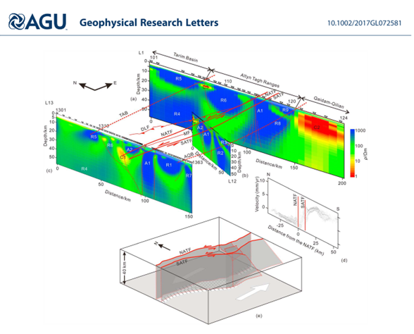 首页 - 研究亮点Geophysical Research Letters:大地电磁剖面揭示阿尔金断裂阿克塞挤压阶区断裂带深部几何结构