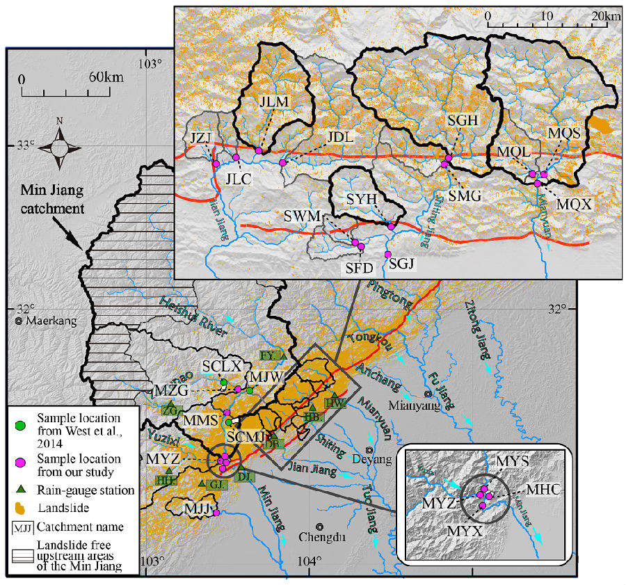 首页 - 研究亮点Earth Surface Processes and Landforms:利用河沙10Be研究2008年汶川地震滑坡物质的震后运移
