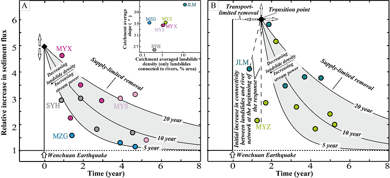 活动造山带中,单次地震对地形地貌的改变塑造往往是通过地壳变形和滑坡侵蚀等作用共同完成的,然而目前对于后者仍缺乏足够的研究。由于堆积在河谷底和边坡上的同震滑坡物质,在震后是被河流逐渐搬运出造山带的,因此探讨其在塑造地形地貌中所发挥的侵蚀作用,仅仅用简单的同震滑坡体体积计算显然是不够的,需要了解滑坡物质是如何被河流体系带出造山带的过程。需要回答的问题包括:(1)什么因素控制着滑坡物质的产生以及震后的运移?(2)震后滑坡松散物质对河流侵蚀会产生什么样的影响,以及这种影响会持续多长时间?(3)地震引起的滑坡物质在地震复发周期内是否能够全部被带离出造山带?