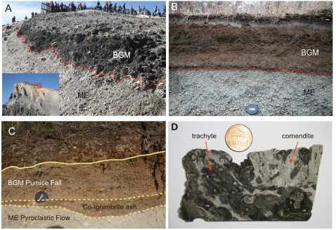 365bet体育网址活动火山研究室潘波博士与合作者,通过野外喷发物分布特征和地层关系,室内喷发物岩相学、岩石地球化学和年代学研究,重新认识理解了千年大喷发,并恢复了其岩浆活动过程。首先,野外系列探槽和剖面中揭示了千年大喷发存在两层特征不同的喷发物,下层为普遍认为的传统千年大喷发灰白色浮岩,上层为被认为八卦庙期的粗面质黑色或杂色浮岩。地层关系上两层喷发堆积物为连续堆积,接触面无风化堆积或次生改造痕迹,表明两者为连续喷发活动(图1)。并根据八卦庙和六号界期喷发物分布特征推测认为这两期喷发物应为千年大喷发的阶段喷发产物和次生堆积,不应为独立喷发事件。另外,堆积物内发现了大量黑白条带的岩浆混合浮岩,进一步说明了千年大喷发为多种岩浆的共同活动。室内岩相学与地球化学分析表明,千年大喷发为三种岩浆的共同喷发,且八卦庙期与六号界期在岩石成分和斑晶特征等方面均与千年大喷发粗面质阶段喷发物相一致,进一步验证野外提出的同期喷发的认识。