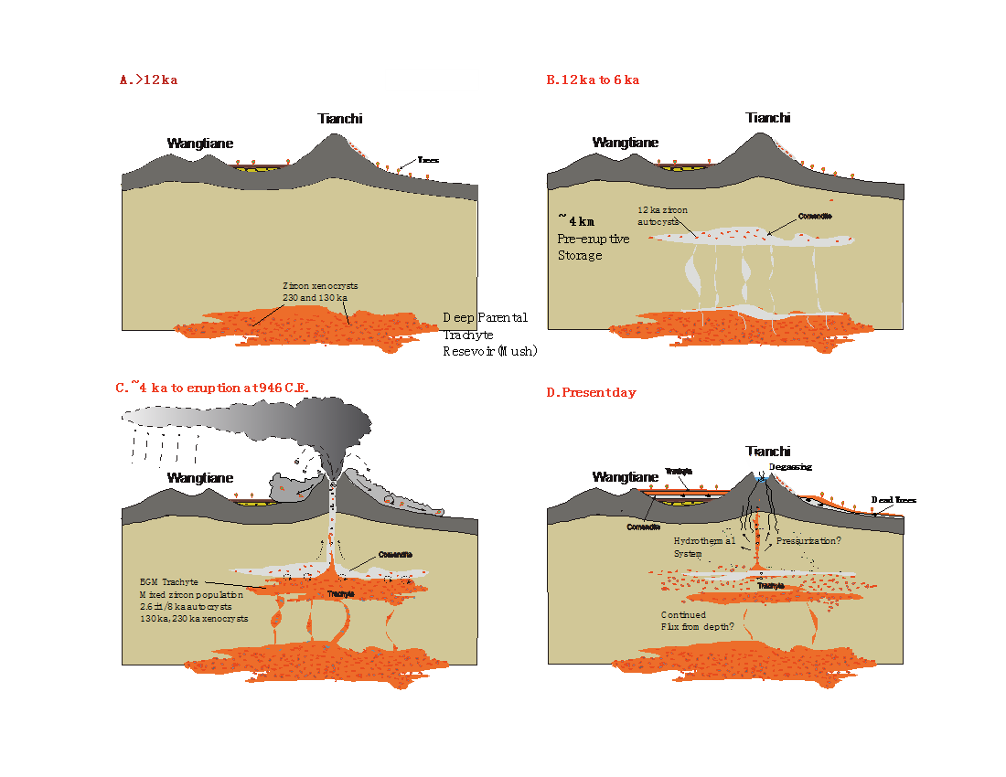 通过进一步岩浆分异演化的计算和岩浆年代学,综合建立了千年大喷发的喷发过程(图2),认为:(1)12 ka前,天池火山下存在粗面质岩浆房,并不断遭受深部粗面质、粗面质安山质和玄武质岩浆的注入和扰动;(2)12 ka至6 ka,粗面质岩浆房内结晶分异演化出碱流质岩浆,碱流质岩浆分离并向上运移储集形成碱流质岩浆房;(3)4 ka至946 CE,一股粗面安山质岩浆自深部注入粗面质岩浆房并向上穿入碱流质岩浆房,引起岩浆混合和岩浆房内的扰动,触发大规模的爆炸式喷发。喷发中上部碱流质岩浆先喷发堆积形成灰白色堆积层,后期粗面质岩浆喷发形成黑色或杂色的堆积层,并大量出现岩浆混合浮岩;(4)现今,天池火山岩浆继续经历着分异演化,并不断受到深部岩浆的注入,引起天池火山的小震震群或火山颤动。