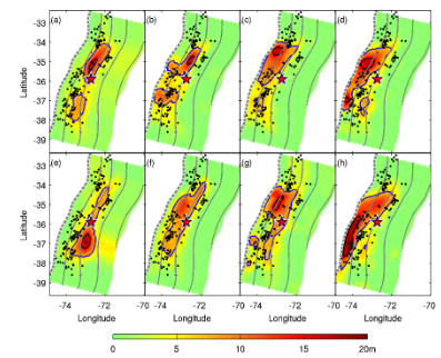 图1. 不同研究组给出的2010年8.8级智利地震的同震滑动模型:(a) Lorito et al., 2011; (b) Delouis et al., 2010; (c) Luttrell et al., 2011; (d) Vigny et al., 2011; (e) Pollitz et al., 2011; (f) Moreno et al., 2012; (g) Yue et al., 2014; (h) 王丽凤等, 2017.