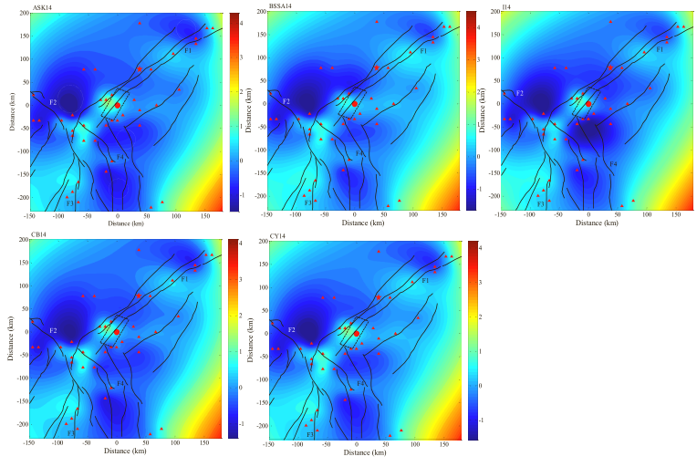 通过比较发现:(1)大部分台站的地表峰值加速度(PGA)和周期T=0.06秒时(芦山地震动的卓越周期)的反应谱幅值及其内部残差分布在五个衰减关系预测平均值一个标准差以内;(2)台站与五个衰减关系预测值间内部残差的标准差在周期T=0.06秒时小于PGA,这表明NGA-WEST2衰减关系对芦山地震高频成分的预测也很好;(3)在断层距大于100公里时,NGA-WEST2衰减模型对芦山地震动长周期分量(例如,T=10.0秒时)预测的内部残差较大;(4)对于芦山地震,NGA-WEST2模型预测的上盘短周期加速度分量要好于上盘长周期分量,此外NGA-WEST2模型的下盘短周期加速度分量要好于上盘;(5)五个衰减关系预测芦山地震动PGA的内部残差二维等值线分布显示在断层压缩方向及向东北方向扩展运动上残差值较大(图2);
