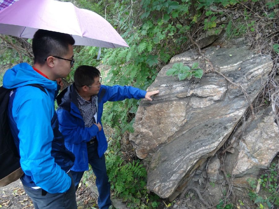 参观结束后,在马胜利、何昌荣、周永胜和杨晓松四位研究员的带领下,全体人员沿云蒙山花岗岩和河防口断裂开展了野外地质实习,通过三个剖面,系统学习了侏罗纪花岗岩侵入到前寒武纪变质岩的侵入接触界线、断层脆性破裂和断层泥与上地壳变形特征、花岗岩中发育的韧性剪切带与中地壳断层脆塑性变形特征、基性岩塑性流变-褶皱变形与下地壳变形特征等地质现象,与室内高温高压实验变形过程与现象进行对比分析与讨论,并采集了部分岩石样品用于实验和微观结构研究。